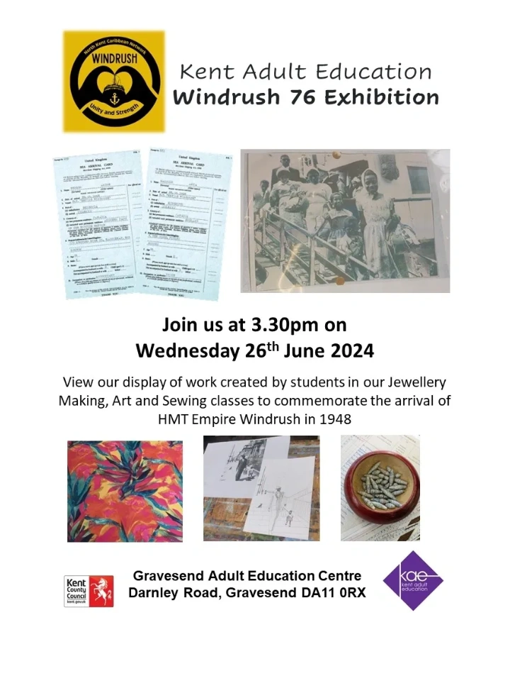 On Wednesday 26th June 2024 at 3.30pm our Windrush elders, staff and students from Gravesend Adult Education Centre gathered to view the work they have been doing in their Art, Jewellery and Sewing classes as part of their first Windrush Generations Project.